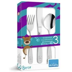 Deze ergonomisch ontworpen Bear kinderbestekset van Amefa helpt kinderen om meer zelfvertrouwen te krijgen aan tafel en maakt de maaltijden nog leuker. De moderne set is gemaakt van 18/0 roestvrij staal met een beertje op elk heft. Voor de veiligheid van je kind zijn de scherpe delen van het mes en de vork afgerond! Bovendien is deze set vaatwasmachinebestendig en heeft het gebruikte roestvrij staal een hoge corrosieweerstand en een hoogglans afwerking.