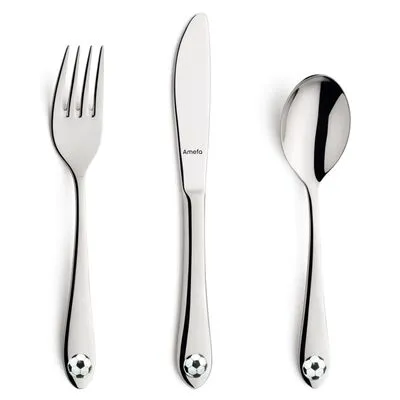 Deze ergonomisch ontworpen Footie kinderbestekset van Amefa helpt kinderen om meer zelfvertrouwen te krijgen aan tafel en maakt de maaltijden nog leuker. De moderne set is gemaakt van 18/0 roestvrij staal met een voetbal op elk heft. Voor de veiligheid van je kind zijn de scherpe delen van het mes en de vork afgerond! Bovendien is deze set vaatwasmachinebestendig en heeft het gebruikte roestvrij staal een hoge corrosieweerstand en een hoogglans afwerking.