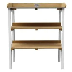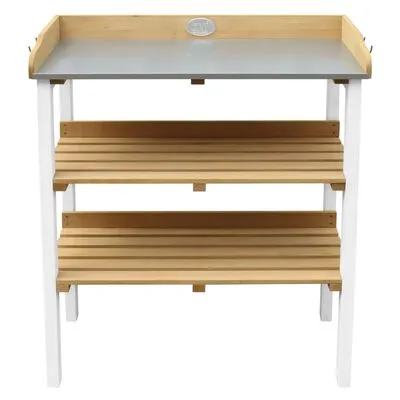 Deze AXI bruin en witte oppottafel met 2 opbergschappen is een praktische aanvulling op je tuin of balkon.