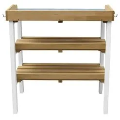 De plantentafel is gemaakt van FSC 100% Hemlock hout en is ontworpen met een zinken werkblad. Deze houtsoort splintert niet en is van nature bestand tegen weersinvloeden, zoals regen, en is bestand tegen rot. De tafel is behandeld met een beits op waterbasis, zonder chemicaliën. Je kunt hem ook gebruiken als bankje. De 2 opbergvakken bieden veel opbergruimte voor planten, tuinaarde en bloempotten. Op het werkblad bieden de 6 haken ook de mogelijkheid om gereedschap zoals een hark of schop op te bergen. Zo heb je je tuingereedschap altijd binnen handbereik. Door de praktische hoogte van het werkblad is deze oppottafel een optimale oplossing voor je rug. Je hoeft niet meer constant te bukken bij het verpotten van je planten.