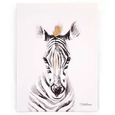 Het prachtige CHILDHOME olieverfschilderij van een zebra, in stijlvol zwart en wit met goudkleurige details, is perfect om de kinderkamer of je woonkamer helemaal af te maken.