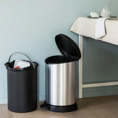 - Metaalachtige afwerking voor een eersteklas uitstraling: de D-vormige pedaalemmer heeft de trendy uitstraling van een metalen prullenbak, maar de voordelen van een kunststof prullenbak. Hij is lichtgewicht en heeft een roest- en deukvrije buitenkant. Vingerafdrukken zijn ook niet te zien op de pedaalemmer.