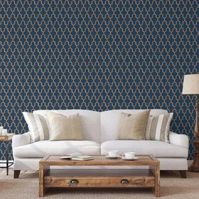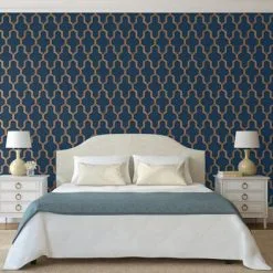 Dit blauw met goudkleurige Geometric behang maakt deel uit van de DUTCH WALLCOVERINGS collectie, een gespecialiseerd merk dat je inspireert met verschillende soorten hoogwaardig behang die geschikt zijn voor elke interieurstijl.