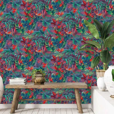 Dit duurzame behang heeft een luxe bloemenontwerp in groen en rood. Het kan droog worden verwijderd zonder je muur te beschadigen.