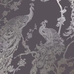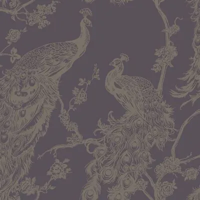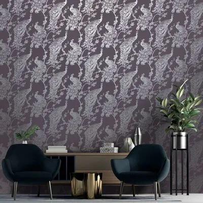 Dit duurzame behang heeft een pauwontwerp in paars en zilver, is scheurvast en kan worden verwijderd met een verwijderingsmiddel of behangstomer zonder je muur te beschadigen.