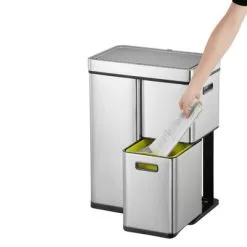 Hij heeft een ideaal gestapeld ontwerp voor optimale ruimtebesparing. Daarnaast is de prullenbak gemaakt van geborsteld roestvrij staal met een vingerafdrukbestendige coating. Het deksel geeft toegang tot een ruim vak met een kunststof binnenemmer van 30 liter en ook een vak met een binnenemmer van 15 liter. Daaronder bevindt zich een vak met een binnenemmer van 15 liter die eenvoudig toegankelijk is via de uittrekbare lade. Bovendien zorgt het sensormechanisme voor hygiënisch gebruik en sluit het deksel geruisloos af. Verder zijn de afvalzakken eenvoudig te verwisselen dankzij het afneembare deksel.