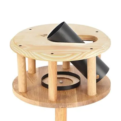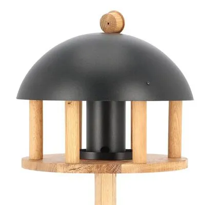Het vogelhuisje beschikt over een silo en is aan de zijkanten open, zodat de vogels altijd met gemak bij het voer kunnen komen. Het ronde zwarte dak biedt voldoende bescherming tegen gevaar van bovenaf en houdt het voer droog. Het vogelvoerderhuisje is van natuurlijk eikenhout gemaakt, waardoor het duurzaam is. Met dit vogelhuisje kun je het voer op een trendy manier aanbieden, in een vogelhuisje met voet die bij je tuin past. Je kunt er ook vetbollen of pinda’s aan hangen, voor de vogelsoorten die graag in de zaadjes en pitjes pikken.