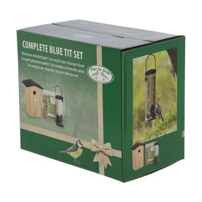 Deze complete vogelvoederset voor pimpelmezen van Esschert Design bevat alles wat je nodig hebt om voor de pimpelmezen in je tuin te zorgen: vogelvoer, voedersilo en zelfs een schattig vogelhuisje van grenenhout.