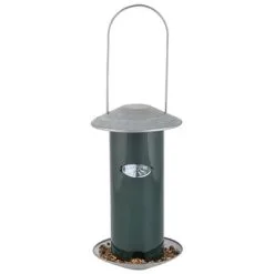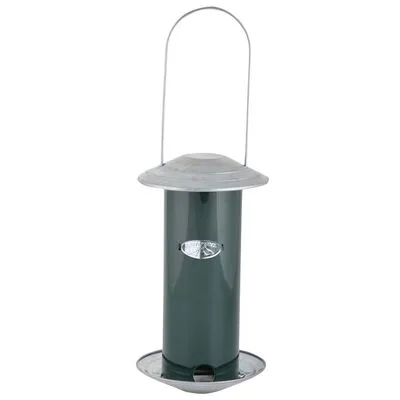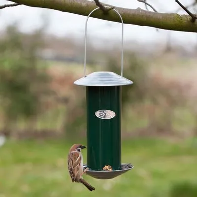 Deze vogelvoerder is gemaakt van zink en metaal waardoor hij duurzaam is en het hele jaar door gebruikt kan worden. Het heeft een grote silo met twee openingen die zorgen voor een gelijkmatige verdeling van het vogelvoer. Bovendien houdt het beschermende dak het zaad droog. Voeg wat zaden toe en de vogeltjes komen elke dag op bezoek voor een traktatie of om uit te rusten!