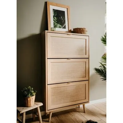 Dankzij de etnische stijl, lichte kleur en mooie, gladde rietprint op de spaanplaat is de kast een opvallende toevoeging aan elke kamerinrichting. De Bali schoenenkast heeft 3 klepdeuren met elk 2 vakken. Hij biedt voldoende opbergruimte en is perfect voor 12 paar schoenen. Deze stabiele Finori schoenenopbergkast is eenvoudig te monteren en heeft dankzij de massief houten poten een mooie uitstraling.