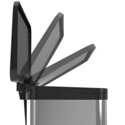 De vuilnisbak heeft drie 9-liter binnenbakken, zodat je het afval kunt scheiden, en een soft-close deksel met een brede opening. Het pedaal, met hygiënisch intern mechanisme, is extra breed voor het gebruiksgemak. De binnenbakken hebben handige handvatten.