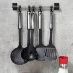 De keukengereiset van HI bestaat uit vijf keukenspatels en lepels en is perfect geschikt om een heerlijke maaltijd te bereiden. Je hangt ze aan het meegeleverde ophangrekje!