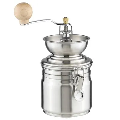 Deze handmatige koffiemolen is gemaakt van roestvrij staal en heeft een handvat met een houten knop en keramische onderdelen.