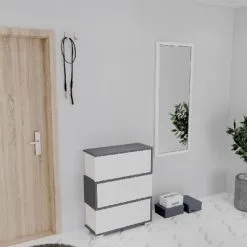 De elegante witte en antraciet kleur geeft een modern tintje aan je interieur. De schoenenkast is ook van 3 kantelbare lades voorzien om je schoenen, laarzen en pantoffels overzichtelijk en netjes uit het zicht op te bergen. De schoenenkast kan een gewicht tot 45 kg dragen. De kast kan ook gebruikt worden als opbergkast voor boeken, tijdschriften en snacks. Hij heeft een strak, up-to-date ontwerp en is eenvoudig te monteren en schoon te maken.