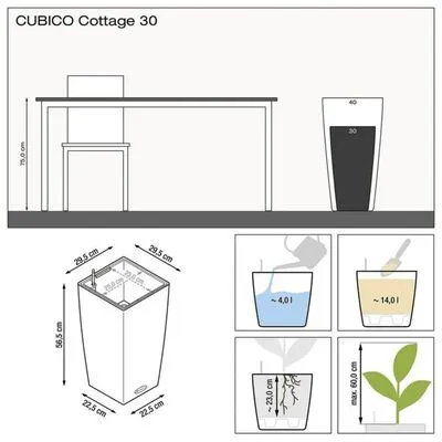 De witte CUBICO Cottage 30 ALL-IN-ONE plantenbak van LECHUZA is perfect voor een enkele bloeiende plant of weelderige arrangementen tot een hoogte van 60 cm.