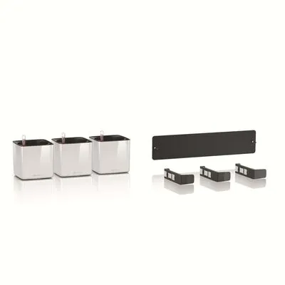 - Levering bevat drie plantenbakken met magnetische beugels, metalen stang, drie binnenbakken, lont-bewateringssysteem en waterniveau-indicatoren
