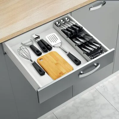 Hij wordt geleverd met drie verplaatsbare verdeelstukken waarmee je het bestek en groot keukengerei optimaal kunt organiseren. Deze uitschuifbare bestekbak is in lengte uit te schuiven tot maximaal 49 cm en is helemaal ingeklapt 40 cm.