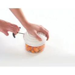 De revolutionaire hakmolen is gemakkelijk te gebruiken en stelt je in staat om snel soepen, sauzen, tapenades, pesto’s, enz. te bereiden. Rotomac presteert als een minikeukenmachine en wordt volledig met de hand aangedreven. De hakker vereist geen batterijen of elektriciteit. Plaats groenten, fruit of kruiden in de container, sluit het deksel en trek aan het snoer met handvat. Hoe vaker aan het snoer wordt getrokken, hoe fijner je groenten worden gehakt. Dankzij de gepatenteerde Zwitserse technologie draaien de superscherpe messen allemaal onafhankelijk van elkaar, waardoor ze zelfs de hardste groenten kunnen doorsnijden zonder dat de messen vast komen te zitten of vastlopen.