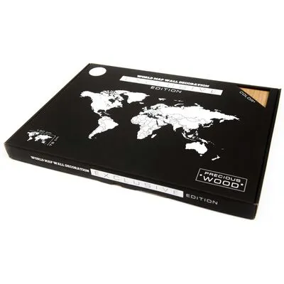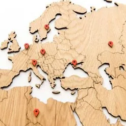 Deze muurkaart is gemaakt van milieuvriendelijk hout dat met een hoog niveau van nauwkeurige lasersnijtechniek gesneden is. Bovendien is hij eenvoudig aan de muur te bevestigen met een uniek doe-het-zelfsysteem. Met de houten begrenzers en positioneringsstrip kan je alle continenten, landen en eilanden correct positioneren. De set bevat 9 grote delen van de wereld, alle accessoires om de wereldkaart compleet te maken, 96 tags in zwart, rood en wit met een originele MiMi-taghouder en 25 kleine eilanden om de kleinste droomlocaties aan te geven.