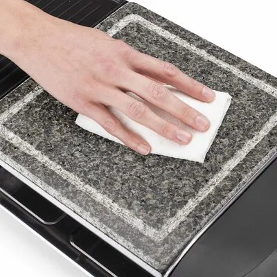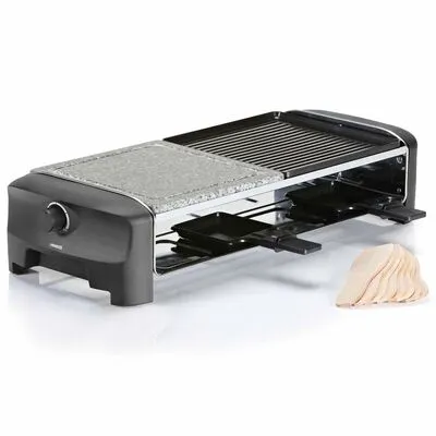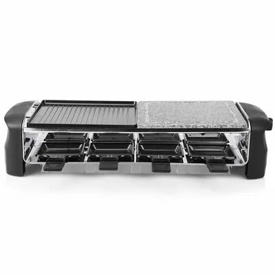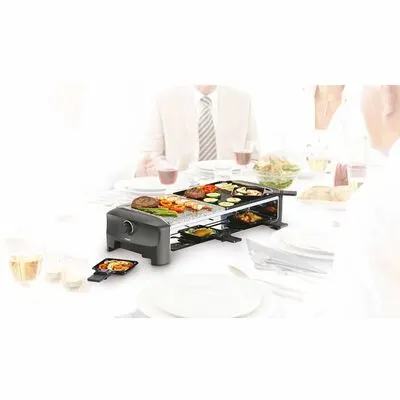 De raclette grill heeft een gegoten aluminiumplaat waarvan beide zijden kunnen worden gebruikt. Dit model bevat ook 8 pannetjes voor het bereiden van verschillende gerechten, zodat 8 personen tegelijkertijd eten kunnen bereiden. De set is makkelijk schoon te maken en alle onderdelen kunnen in de vaatwasser.
