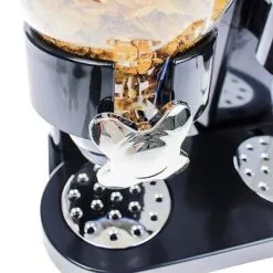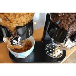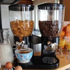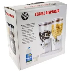 Dit geweldige keukenaccessoire voor het ontbijt zorgt voor het luxueuze gevoel van hotelvoorzieningen. Houd gewoon een kom onder de dispenser, draai aan de uitgifteknop en de cornflakes of muesli komt er gedoseerd uit. De dispenser is gemaakt van kunststof en heeft twee houders. In elke voedselhouder past ongeveer 500 gram (afhankelijk van het type droog voedsel) en er wordt ongeveer 30 gram afgegeven per draai aan de doseerknop.