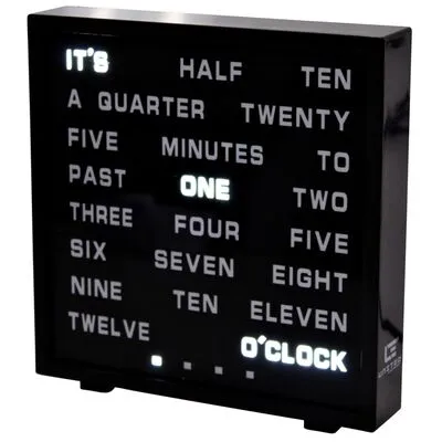 De tijd is eenvoudig aan de zijkant van de klok in te stellen en de woorden lichten op in helderwit LED-licht. Hij kan worden opgehangen of op een tafel geplaatst worden.