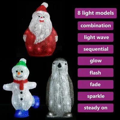 Deze kerstfigurenset is gemaakt van sterk acrylmateriaal. Hij wordt geleverd met een kerstman, een sneeuwpop en een pinguïn. Bovendien is deze kerstversiering voorzien van 75 LED-lampjes, die energiezuinig zijn en lang meegaan. Hij is ontworpen met 8 verschillende lichteffecten: een combinatie van alle effecten, langzaam gloeiend, glinsterend/flitsend, golvend, achtervolging/stromend water, sequentieel, constant aan en langzaam uitgaand. De set geeft prachtig licht en creëert een magische kerstsfeer. Dankzij de waterbestendige batterijbehuizing kan de kerstfigurenset ook buiten worden gebruikt.