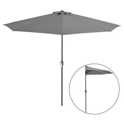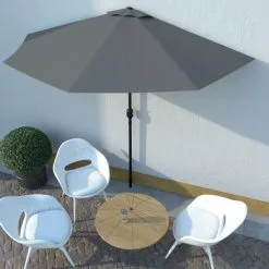Het parasoldoek is gemaakt van uv-beschermend en anti-vervagend polyester waardoor het je optimale bescherming tegen de zon biedt en het gemakkelijk schoon te maken is. De paaldiameter is 38 mm waardoor hij in een voet of in het midden van een tafel geplaatst kan worden. Het halfronde ontwerp draagt bij aan de unieke charme van de parasol. De sterke aluminium paal en de 5 stevige stalen baleinen maken de parasol zeer stabiel en duurzaam. De tuinparasol kan eenvoudig geopend en gesloten worden dankzij het zwengelmechanisme. Het product is eenvoudig te monteren.