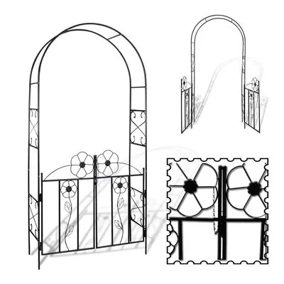 Deze rozenboog met hekjes is ideaal voor elke tuin of terras. De hekjes hebben een elegant bloemen design. Deze rozenboog is perfect voor uw klimplanten en ondersteunt daarnaast zelfs de zwaarste (klim)planten. Deze regen boog is namelijk gemaakt van weerbestendig duurzaam ijzer. De afmetingen van deze rozenboog zijn: 115 cm breedte, 230 cm hoogte en 37 cm diepte. Voor extra stabiliteit kunt u ervoor zorgen om de rozenboog in de grond vast te zetten.