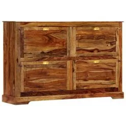 Deze schoenenkast is gemaakt van massief sheeshamhout, dat zeer duurzaam is. Sheesham is een tropisch hardhout dat bekend staat om zijn rijke nerven en ook wel rozenhout of palissander genoemd wordt. Elke stap van het proces wordt met de grootste zorg uitgevoerd, of het nu gaat om polijsten, schilderen of lakken. Het uitmuntende vakmanschap en de mooie houtnerven maken elk meubel uniek en anders dan de rest. De kast heeft voldoende opbergruimte om je schoenen netjes en binnen handbereik te houden.