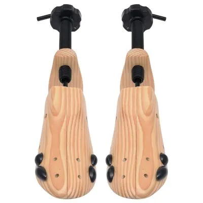 Dit paar schoenenstrekkers is gemaakt van massief grenenhout, wat vocht kan opnemen en onaangename geuren kan elimineren. Je kan de knop en de L-vormige haak draaien om de lengte en breedte aan te passen. De gaten in de schoenvormers en de meegeleverde pluggen bieden drukpuntverlichting.