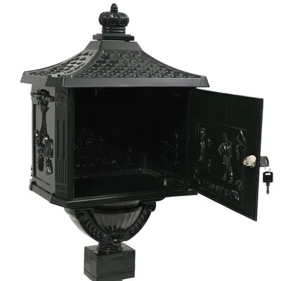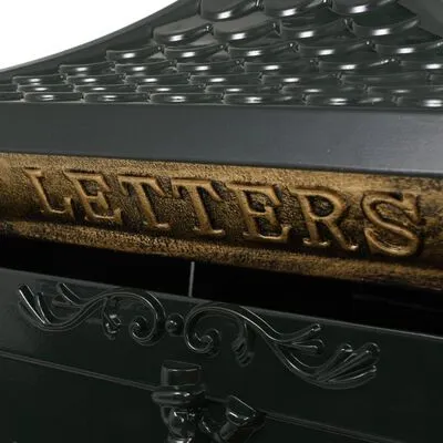 Deze brievenbus is ontworpen met een brede gleuf die een flap heeft om de inhoud tegen de elementen te beschermen. Daarnaast heeft de brievenbus een afsluitbaar deurtje (inclusief 2 sleutels) voor het eenvoudig uitnemen van de post. De brievenbus is gemaakt van weerbestendig en roestvast gegoten aluminium, waardoor hij zeer geschikt is voor buitengebruik. Hij is versierd met een overvloed aan prachtig, vintage-achtige decoratieve details en zal een echte blikvanger zijn op je oprit of bij je voordeur.