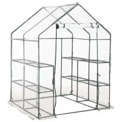 Deze tuinkas bestaat uit een roestbestendig stevig stalen frame en PVC folie, die superieure duurzaamheid en langdurig gebruik garanderen. Deze kas is gebouwd met 8 bedrade schappen (4 aan elke kant) en biedt voldoende ruimte aan kiemplanten, bloeiende bloemen, verse kruiden en groenten. De transparante kunststof hoes zorgt ervoor dat het zonlicht je planten en bloemen kan bereiken en je je planten in de gaten kunt houden. Hij is ontworpen met een oprolbare deur met ritssluiting, wat zorgt voor goede luchtcirculatie en gemakkelijke toegang tot je planten.