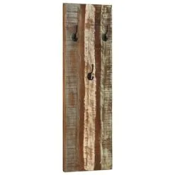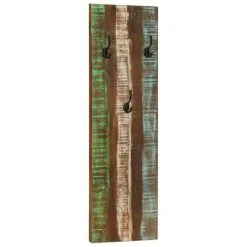 De kapstok is gemaakt van massief gerecycled hout. Dit is een combinatie van teruggewonnen hout, waaronder teakhout, mangohout, grenenhout en beukenhout. Dit hout is afkomstig van oude gebouwen, zoals fabrieken en schuren, maar ook van boten. Dit betekent dat het een milieuvriendelijke optie is voor het maken van meubelen. Omdat elk meubelstuk handgemaakt is, variëren de kleuren van blauw, groen en crème tot oranje, rood en roze tinten. Hierdoor is elke kapstok uniek! Elke kapstok heeft 3 haken voor het ophangen van tassen, jassen, paraplu’s, sieraden, sleutels, enz. De set kan eenvoudig aan de muur gemonteerd worden.