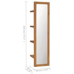 De badkamerspiegel is gemaakt van massief teakhout met een natuurlijke afwerking, waardoor hij vrij stabiel en gemakkelijk te onderhouden is. Deze houten spiegel heeft vier open schappen aan de achterzijde waardoor hij niet alleen gebruikt kan worden om in de spiegel te kijken maar ook voldoende ruimte biedt voor het plaatsen van shampoos, cosmetica, tandpasta’s, enz. Daarnaast zijn er aan de achterkant montagegaten aangebracht zodat dit product stevig aan de muur kan worden gehangen.